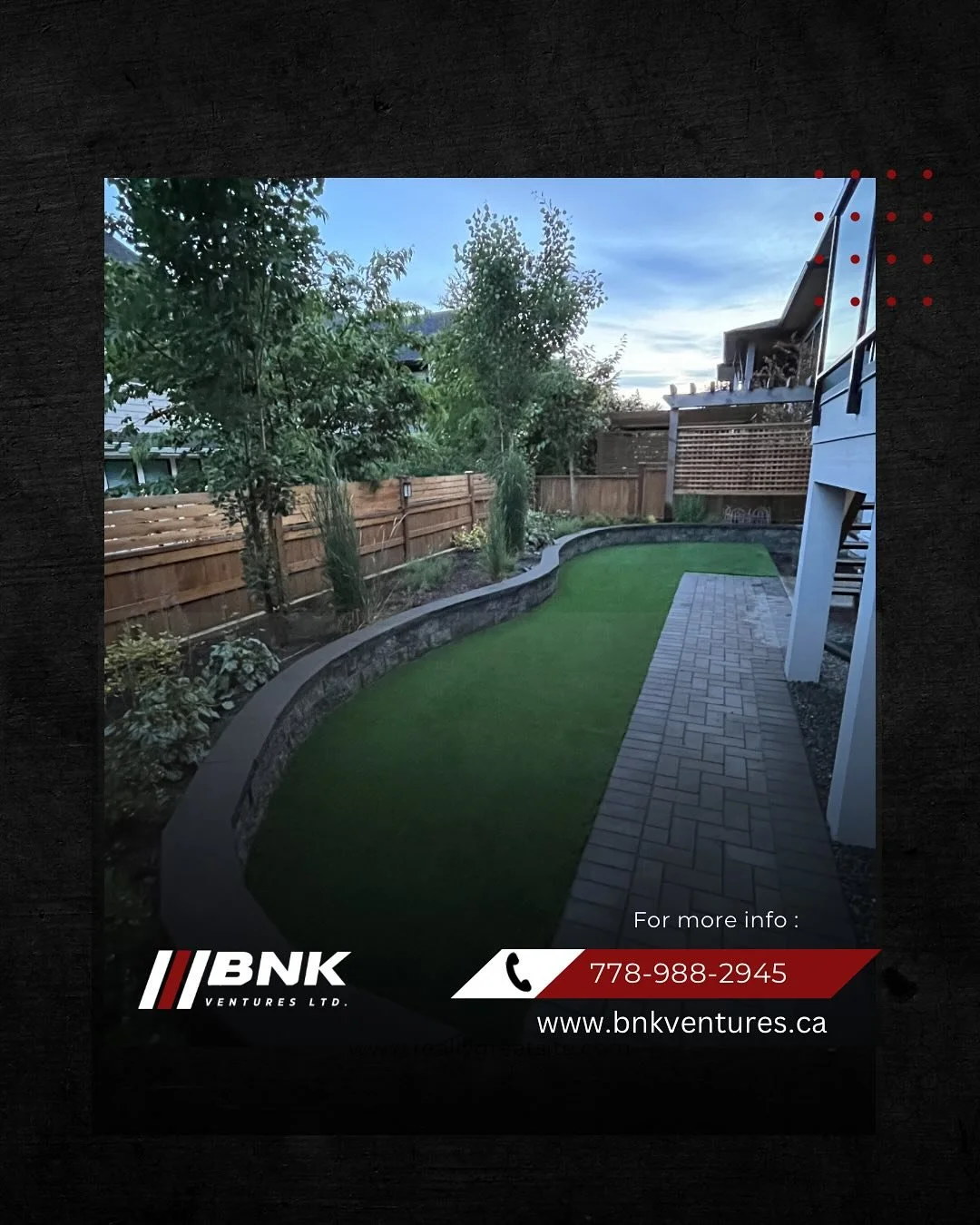 “BNK Ventures was recommended to me by my neighbour. I had a flooding issue due to new sidewalk and turf installation. Brandon came out to look at the issue. I received a quote within a few days. Once I had decided to hire BNK We set up a date. Brandon and his co worker were here on time, walked me through the job and completed it within 4 hours. They were professional and rectified the problem.